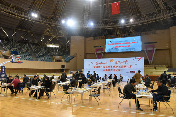 为全面贯彻落实国务院《全民健身条例》,促进中华优秀传统文化的传承与发展,在广大职工中进一步弘扬劳模精神、劳动精神、工匠精神,不断提升职工群众的幸福感、获得感,2019年2月27日上午,全国教科文卫体系统职工围棋比赛云南赛区选拔赛在我校呈贡校区西区体育馆举行,来自全省教育系统和卫生系统19支队伍56名队员参加了比赛,云南师范大学党委副书记张玮出席了活动。本次比赛由云南省教育卫生科研工会主办,云南师范大学承办。本次比赛还得到了云南省棋牌中心协办支持。