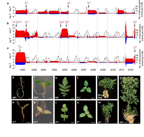 为了鉴定这些有害突变的遗传效应,研究人员构建了3个自交群体,并开发了一套不依赖于亲本的基因分型方法。基于该方法,在三个群体中鉴定了15个极端偏分离的区域,暗示这些区域含有大效应的有害突变。结合表型分析,鉴定了5个纯合致死位点以及4个影响长势的位点。研究人员对其中的一个致死突变ar1进行了图位克隆和功能验证,发现它控制胚的发育。等位基因频率分析发现,ar1在马铃薯群体中是一个稀有突变。有意思的是这些大效应的有害突变主要位于重组率比较高的区域,说明是可以通过遗传重组将它们有效清除的。