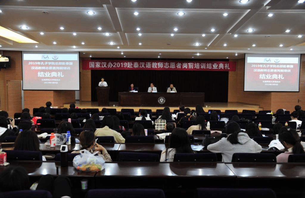 2019年4月9日上午,由孔子学院总部主办、云南师范大学汉语国际推广师资培训基地(昆明)承办的2019年赴泰国汉语教师志愿者培训结业典礼在我校一二一西南联大校区田家炳书院二楼报告厅举行。云南师范大学国际汉语教育学院院长、汉语国际推广师资培训基地(昆明)执行主任王秀成教授,国际汉语教育学院副院长李天明,汉推基地办公室负责人严钰,以及汉推基地全体工作人员,教师代表、班主任,来自云南、湖南的131名培训学员共同出席了结业典礼。