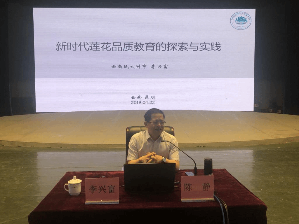 4月22日上午,云南省“万名校长培训计划”第二期名家讲座第15讲在昆明理工大学红土会堂举行,云南民大附中校长李兴富以《新时代莲花品质教育的探索与实践》为主题,为云南省“万名校长培训计划”第二期参训的1000名学员授课。讲座由云南西南联大干部教育学院、云南教育干部培训中心副研究员、硕士生导师陈静主持。