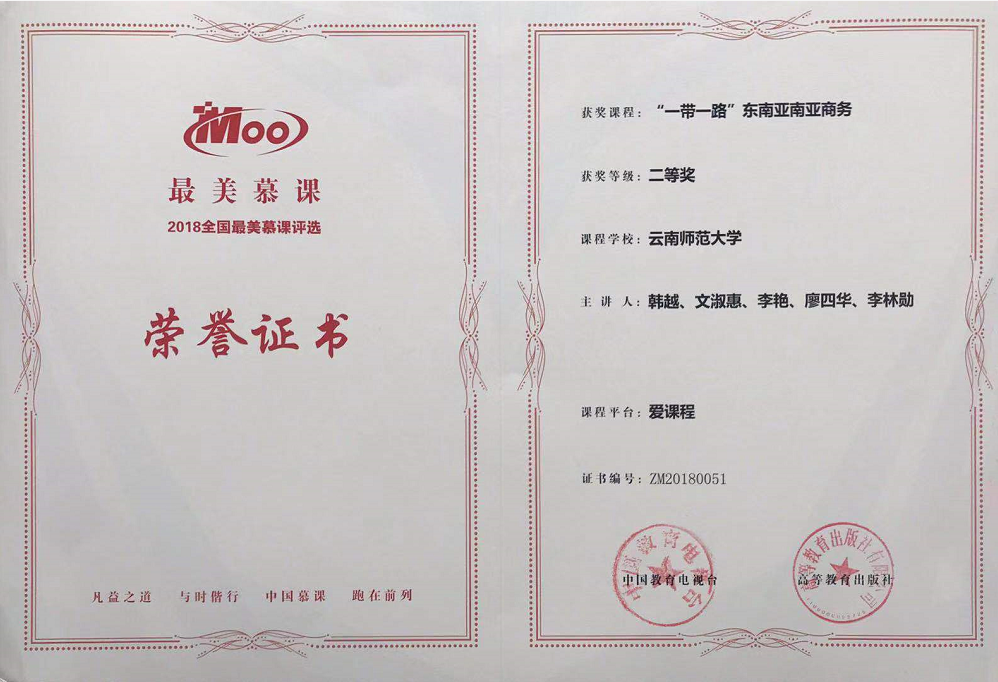 近日,我校泛亚商学院韩越教授负责的《“一带一路”东南亚南亚商务》在线开放课程入选“最美慕课——首届中国大学慕课精彩100”,慕课荣获二等奖,也是云南省唯一获奖课程。