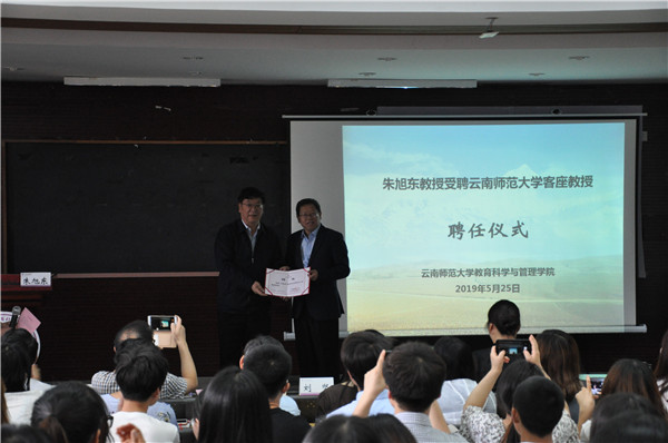 朱旭东教授现任教育部普通高校人文社会科学重点研究基地北京师范大学教师教育研究中心主任、北京师范大学教育学部部长、《教师教育研究》副主编,是教育部“国培计划”专家库首批专家。鉴于朱旭东教授在学术研究和博士生培养方面的卓越建树和丰富经验,教管学院特意邀请朱旭东教授为“滇峰·红土”教育论坛开第一讲。博士生导师郑勤红教授、硕士生导师尤伟琼教授、教管学院副院长张向众教授,以及院内外博士、硕士研究生共一百多人参加聘任仪式,并聆听了朱旭东教授的学术讲座。
