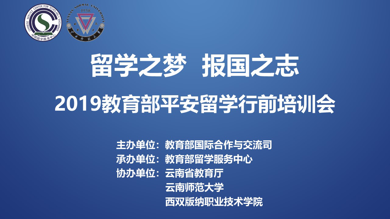 2019年6月13至14日,由教育部国际合作与交流司主办,教育部留学服务中心承办,云南省教育厅、云南师范大学国际学院“教育部出国留学培训与研究中心(后简称中心”、西双版纳职业技术学院协办的“留学之梦、报国之志——2019年教育部‘平安留学’行前培训会”在西双版纳成功举办。来自云南省、北京市、河北省等省内外的近300名公派留学、自费留学人员及负责出国留学的工作人员参加了培训。