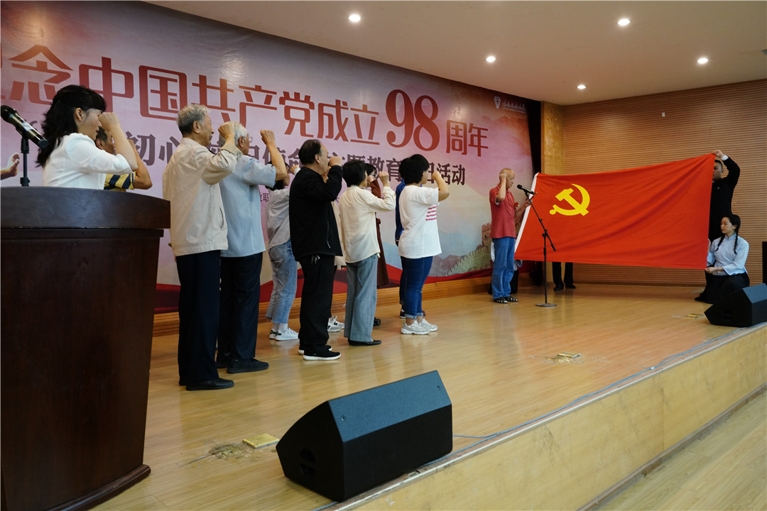 全场人员庄严齐唱中华人民共和国国歌拉开了主题活动的帷幕。学校党委副书记张玮同志代表学校向老党员和青年学生党员们致以节日的问候,向受表彰的“规范化建设达标党支部”、优秀党员、优秀党务工作者表示热烈的祝贺。张玮副书记在讲话中强调,在党的98岁生日到来之际举办“不忘初心、牢记使命”主题教育党日活动,其目的是回顾党的光辉历史,总结党的丰功伟绩,树牢“四个意识”,坚定“四个自信”。张副书记要求,要充分利用好“老少共建”平台,充分发挥老党员的经验优势、政治优势、威望优势,坚持让信仰坚定的老党员给青年学生党员讲历史、讲传统、上党课,帮助青年学生扣好人生的第一粒扣子,广大党员要不忘初心、牢记使命,永葆爱党、忧党、兴党、护党的政治本色。