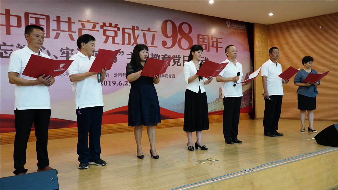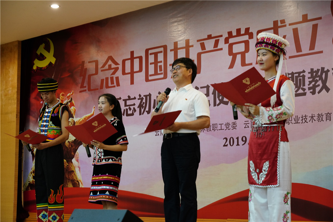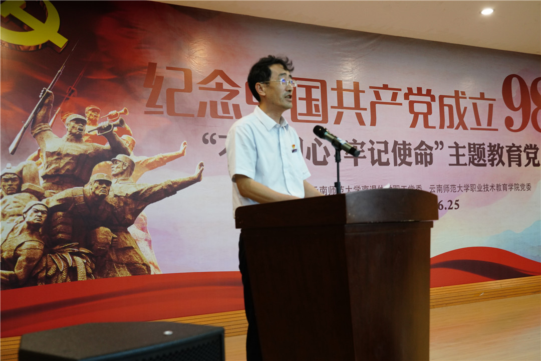 为庆祝中国共产党成立九十八周年,离退休教职工党委与职业技术教育学院党委于2019年6月25日下午,在一二一联大校区田家炳教育书院二楼报告厅联合举办“不忘初心、牢记使命”主题教育党日活动。云南师范大学党委副书记张玮同志,云南省委老干部局政治待遇处魏晓东同志,学校老领导,组织部、宣传部、学生处、一二一联大校区管委会、保卫处、职业技术教育学院等单位负责人,老党员、青年学生党员共250人参加了此次活动。活动由“表彰先进”和“颂歌献给党”两个部分组成,分别由离退休教职工党委书记王琼玲同志、周林老师和职业技术教育学院学生王梦雅主持。