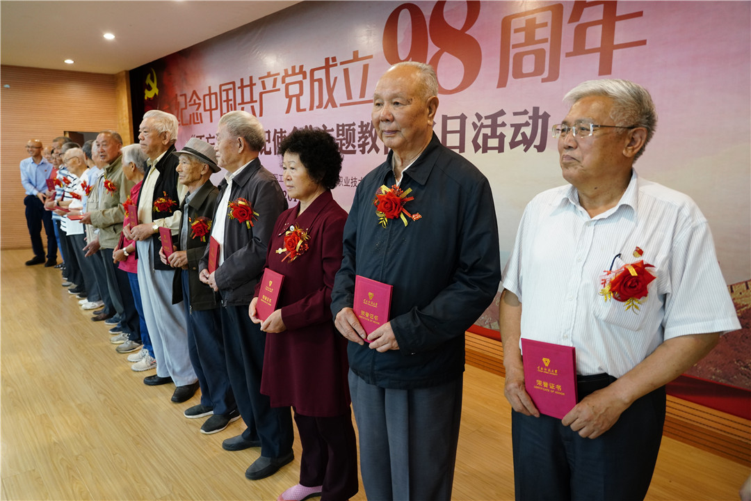 接下来就是“重温入党誓词”,颁发“政治生日”纪念卡及“表彰先进”的环节。具有61年党龄的老党员张运贵同志带领全场党员重温入党誓词,离退休教职工党委李进同志,职业技术教育学院党委和红军同志向12位老党员和青年学生党员赠送“政治生日”纪念卡。接下来就是对“规范化建设达标党支部”、优秀党员、优秀党务工作者的表彰,离退休教职工党委书记王琼玲宣读《表彰决定》,参加主题活动的职能部门领导向荣获2018年度“规范化建设达标党支部”、优秀党员和优秀党务工作者颁发荣誉证书,吴宝璋同志代表优秀党员做了精彩的发言。