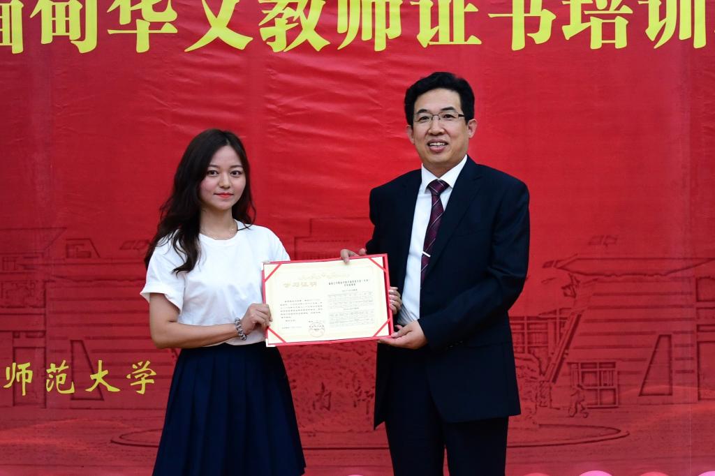 云南华文学院王秀成院长为2017级缅甸云华职业学院学前教育专业毕业学生逐一颁发学习证明。出席仪式的全体领导和嘉宾为2019年缅甸华文教师证书培训班全体学员颁发培训结业证书并合影留念。