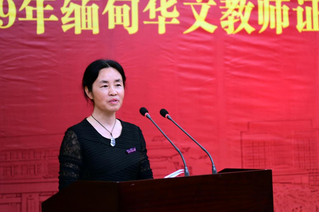 云南省委统战部国外侨务处甘露云副处长在讲话中肯定了云南华文学院承办的2019年缅甸华文教师证书培训班,认为大家学有所获、观有所感,不仅收获了知识还收获了友谊,增长了见识,达到了培训预期的成果。各位学员通过参加本次培训学习,会对习近平总书记“团结统一的中华民族是海内外中华儿女共同的根,博大精深的中华文化是海内外中华儿女共同的魂,实现中华民族伟大复兴是海内外中华儿女共同的梦”这三句话有更深切的体会。甘露云副处长表示,每位学员亲眼目睹了中国改革开放40多年来的崭新面貌,感受到了祖籍国人民的热情,亲切体会到了“血浓于水”的亲情,进一步增进了对祖籍国的感情和认同。他还引用梁启超先生的《少年中国说》,鼓励全体学员成为“华文教育的未来和希望”,为缅甸的华文教育发展做出自己的努力。