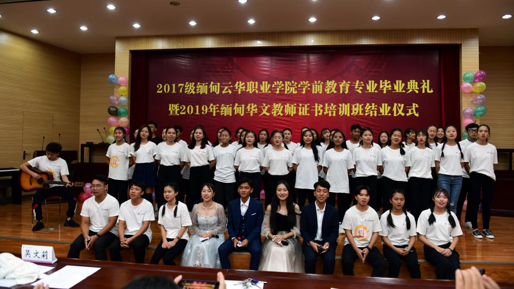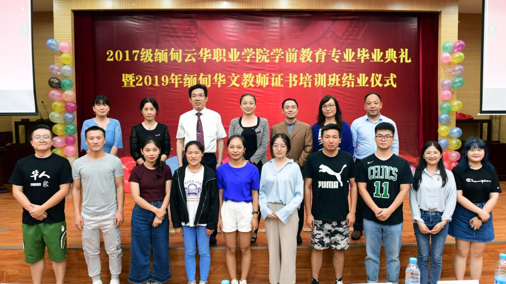 7月25日晚,我校云南华文学院举办了2017级缅甸云华职业学院学前教育专业毕业典礼暨2019年缅甸华文教师证书培训班结业仪式。云南省委统战部国外侨务处副处长甘露云、云南海外文化教育中心缅甸分中心主任唐建军,云南华文学院相关领导、教师以及2019年缅甸华文教师证书培训班、2019年缅甸华文教师教材教法培训班的89名缅甸学员参加了活动。仪式由云南华文学院常务副院长段洁云主持。