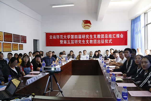9月4日下午,云南师范大学第四届研究生支教团总结汇报会暨第五届研究生支教团出征仪式在大学生活动中心209会议室举行。校党委副书记李宏、校团委书记刘莹、相关职能部门领导、学院党委副书记代表、学院团委书记代表、第四届研支团全体成员、第五届研支团全体成员及学生代表40余人参加会议。会议由校团委副书记郑伟俊主持。