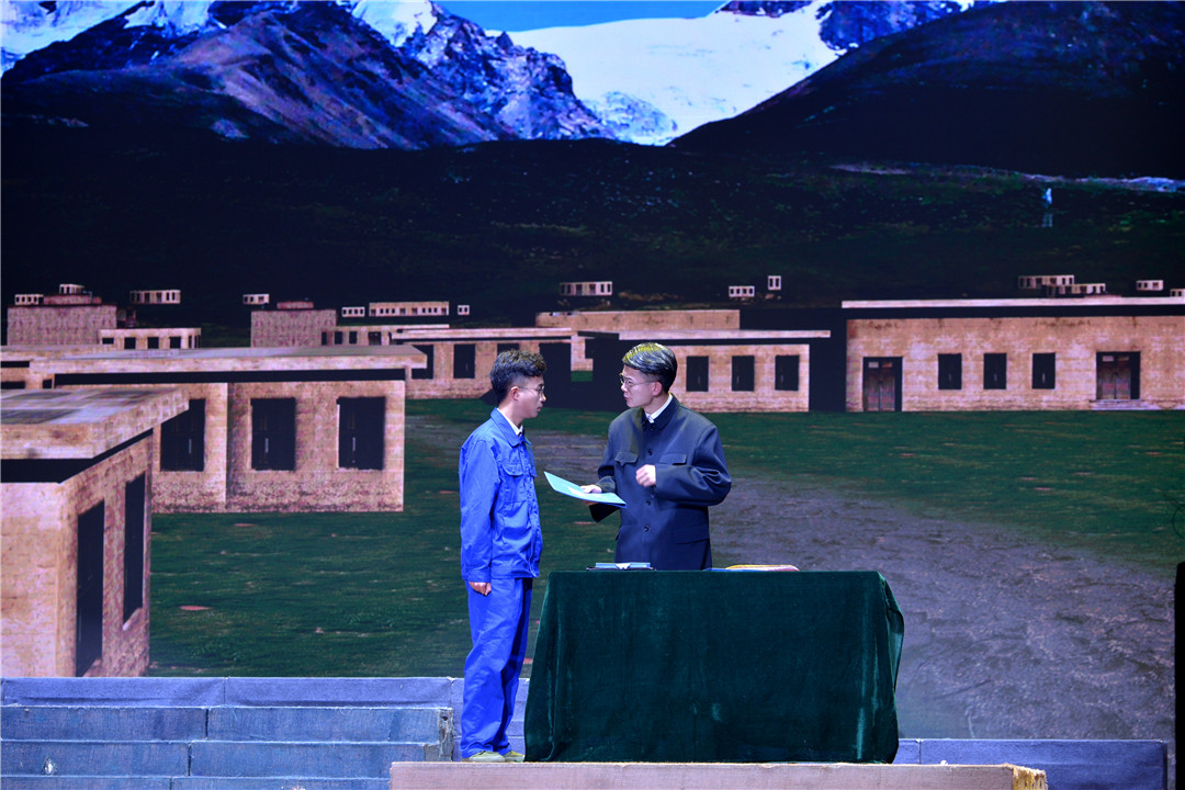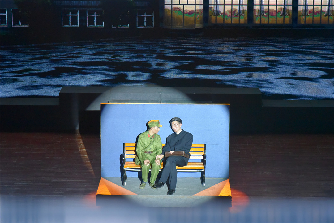 在隆隆的炮火声和《西南联大校歌》铿锵有力的歌声中,演出缓缓拉开序幕。《永怀之歌》高度浓缩了郭永怀一生的学研之旅、精神之旅、情感之旅和奋斗之旅。话剧共分四幕——《绝徼移栽桢干质》《赤子归时抵百师》《英雄仗剑入昆仑》和《留取丹心照汗青》,分别讲述了郭永怀在西南联合大学求学、前往美国深造取得丰硕科研成果、新中国成立后毅然归国来到青海参与“两弹一星”项目研制以及从兰州飞往北京途中以身殉国的四个故事,再现了郭永怀高尚的情操和品质。舞台身临其境的场景和音效,为观众们还原了一幕幕真实的历史画面,让人仿佛回到共和国初期那段艰苦奋斗、舍身创业的激情岁月。演出中,演员们或慷慨独白、或深情抒怀,跌宕起伏的剧情牢牢抓住了观众们的思绪与情感,每一幕结束都迎来观众们的阵阵掌声,大家无不被主人公一片赤诚的报国之心所打动,为一幕幕离愁别恨的家国情怀所感染。