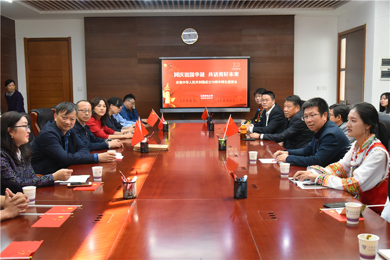 10月1日上午11时,以“同庆祖国华诞,共话美好未来”为主题的庆祝中华人民共和国成立70周年师生座谈会在我校呈贡主校区行政楼会议室举行。会议由校党委副书记李宏主持。相关职能部门和学院负责人、优秀一线教师代表、优秀辅导员代表、民主党派代表和校团学干部代表、习近平新时代中国特色社会主义思想学生宣讲团等师生代表参加座谈会。