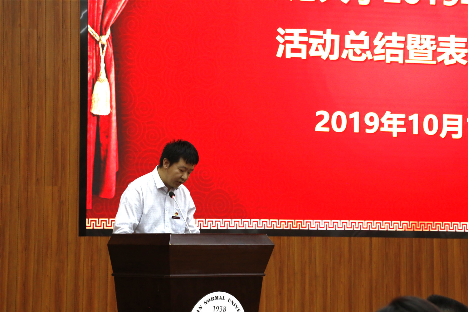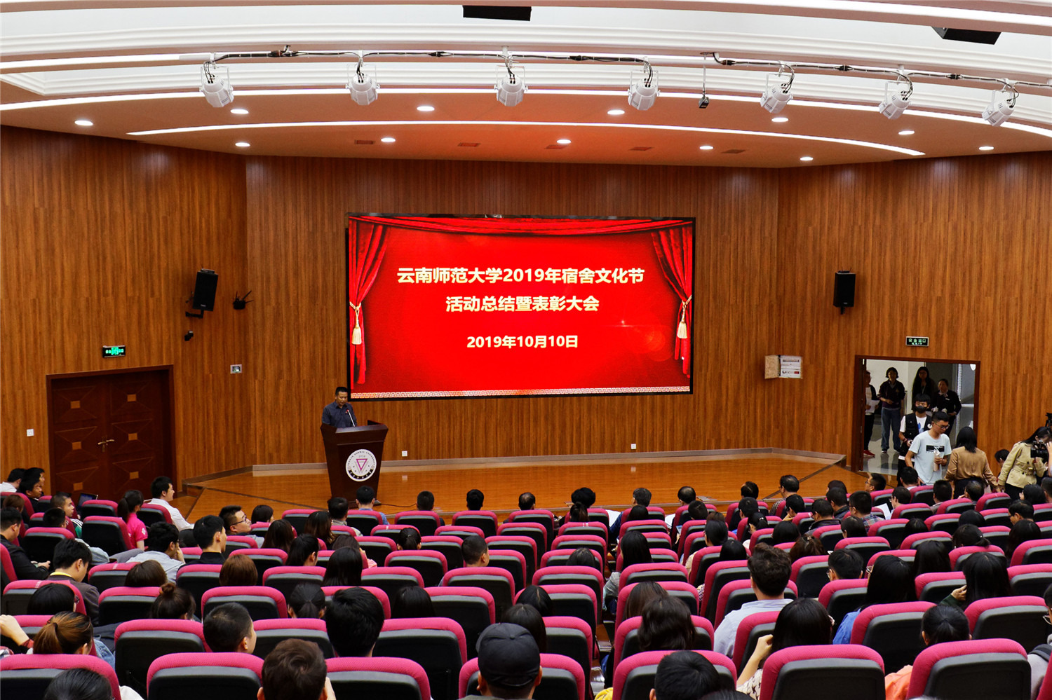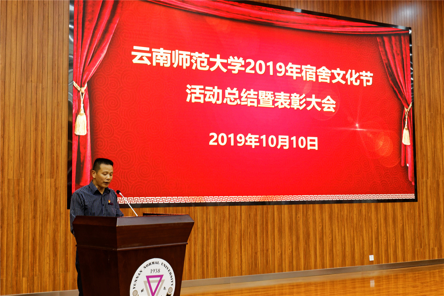 2019年10月10日下午,我校2019年宿舍文化节活动总结暨表彰大会在呈贡主校区汇学楼2栋101报告厅举行。校党委副书记李宏,副校长牛治亮,党委组织部、党委宣传部、研究生工作部、学生处、校团委、保卫处、后勤保障服务中心等部门负责人,各学院党委副书记、教师代表,获奖学生代表等参加了表彰会。会议由学生处处长杨卫国主持。