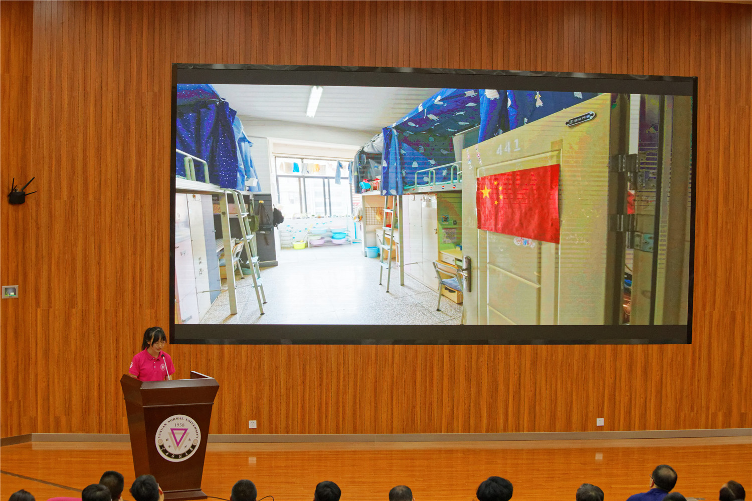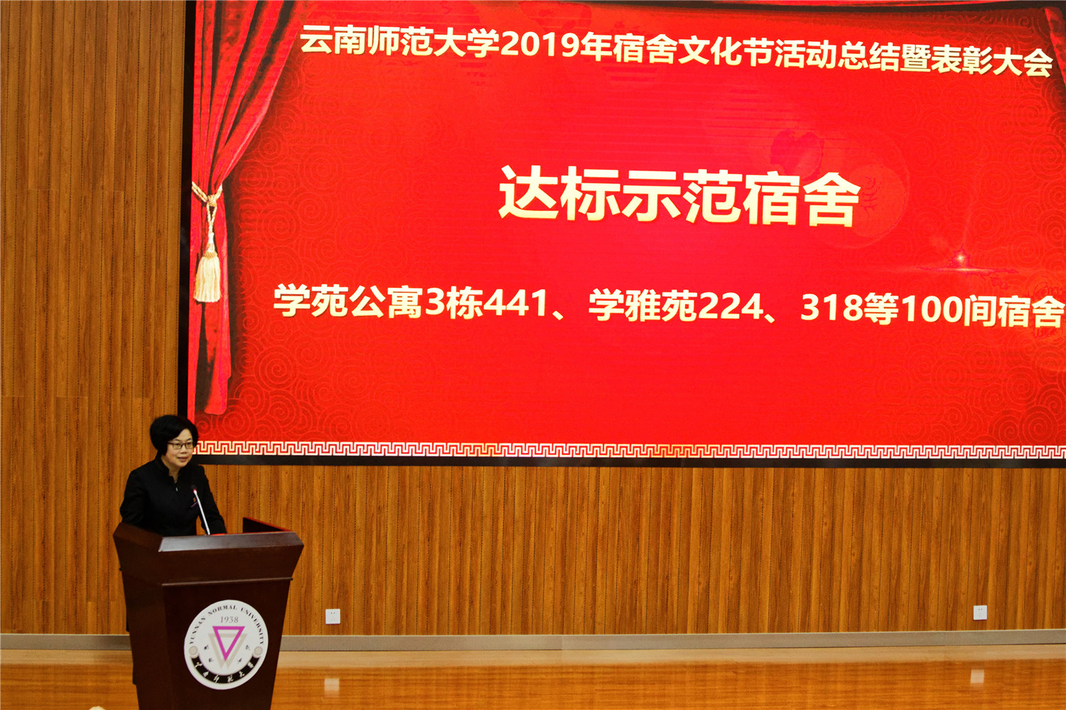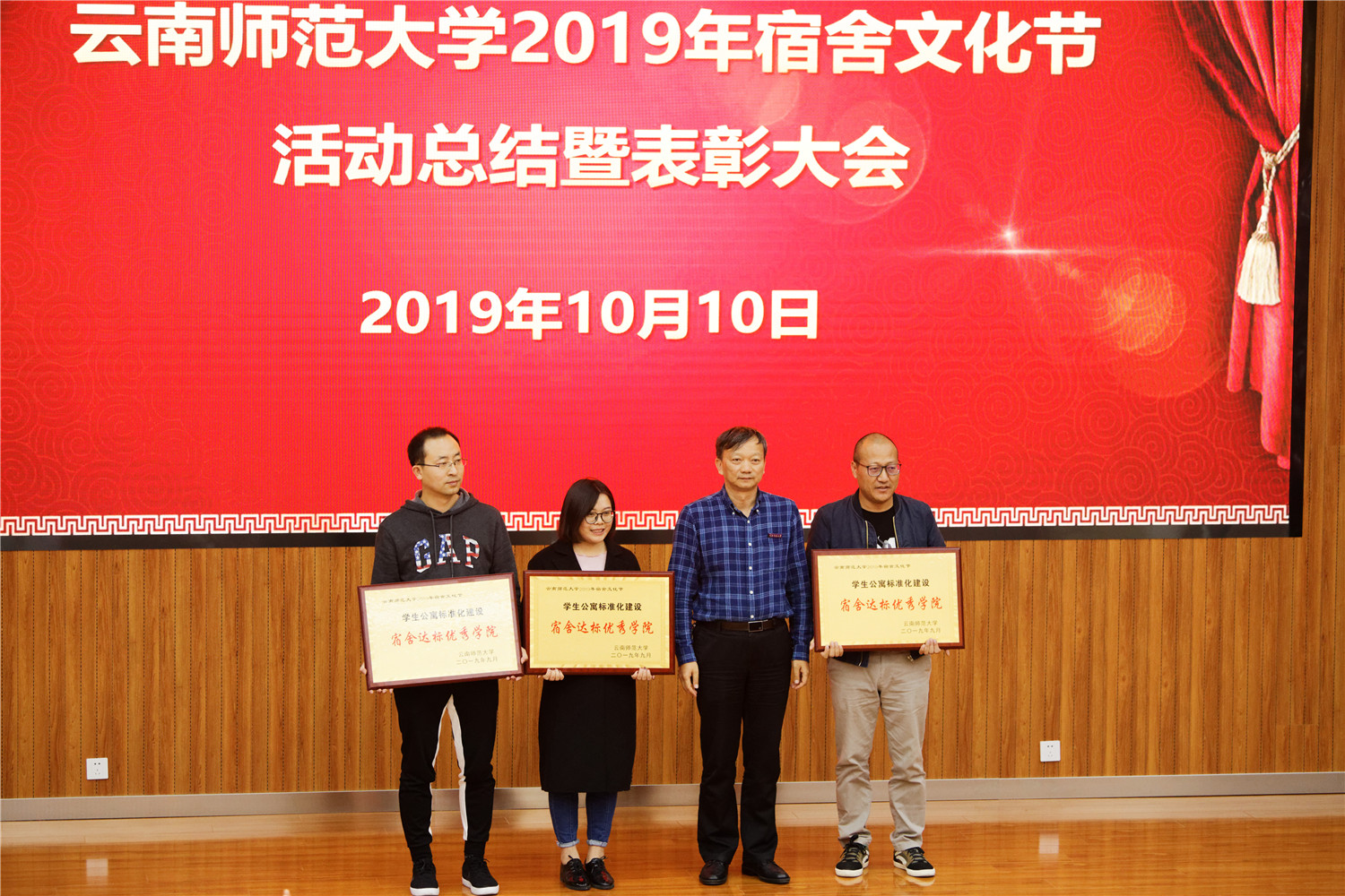 后勤保障服务中心龙梅主任宣读学校下发的《云南师范大学关于公布2019年宿舍文化节活动表彰结果的通知》文件,公布了此次宿舍文化节中的获奖单位及个人。校领导和各参会部门负责人对此次宿舍文化节中获奖的学院、集体、宿舍及个人颁发奖牌及奖状,获奖单位教师和学生代表精神饱满、笑脸盈盈依次上台领奖,并合影留念。
