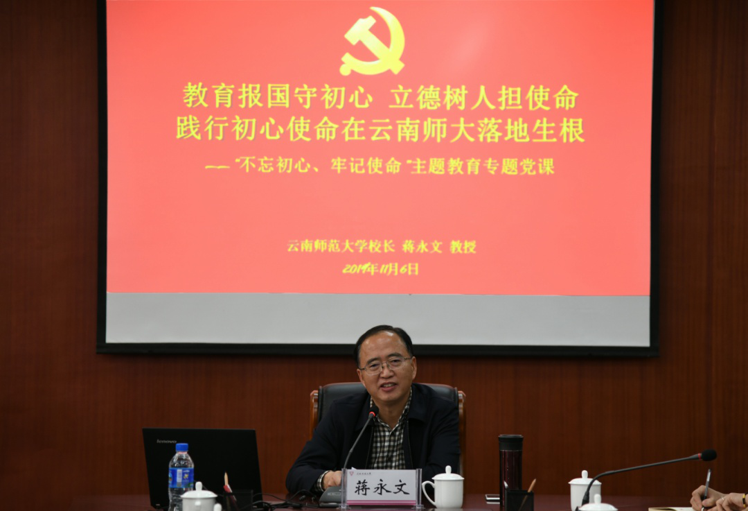 为认真贯彻落实中央、省委关于主题教育部署要求,按照《云南师范大学党委领导班子开展“不忘初心、牢记使命”主题教育实施方案》安排,11月6日,校党委副书记、校长蒋永文同志在华文学院作了题为“教育报国守初心,立德树人担使命,践行初心使命在云南师大落地生根”的专题党课。华文学院、文学院、泛亚商学院、发展研究中心领导班子成员、党支部书记、师生党员代表参加了本次党课。