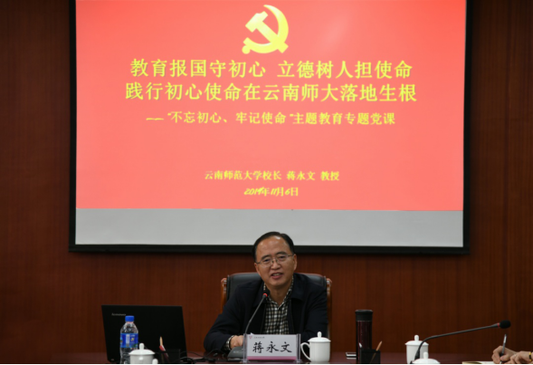 为认真贯彻落实中央、省委关于主题教育部署要求,按照《云南师范大学党委领导班子开展“不忘初心、牢记使命”主题教育实施方案》安排,11月6日,校党委副书记、校长蒋永文同志在华文学院作了题为“教育报国守初心,立德树人担使命,践行初心使命在云南师大落地生根”的专题党课。华文学院、文学院、泛亚商学院、发展研究中心领导班子成员及上述学院党支部书记、师生党员代表参加了本次党课。