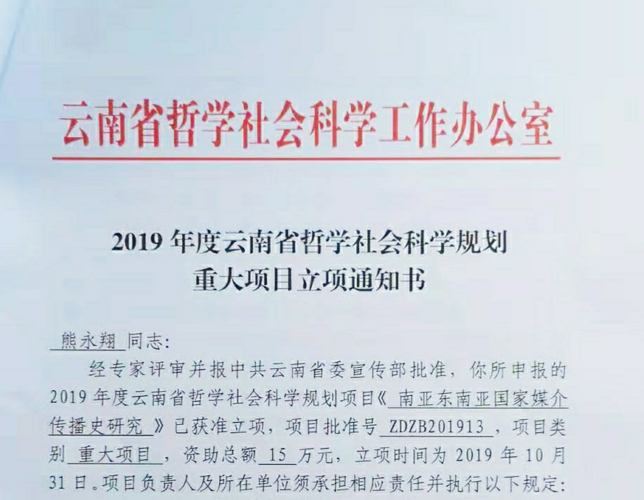 近日,中共云南省委宣传部公告了2019年度云南省哲学社会科学规划重大项目、重点项目立项名单。在所立项的13项重大项目中,我校安学斌教授领衔的“新中国70年云南民族文化保护传承发展研究”和传媒学院申报的“南亚东南亚媒介传播史研究”获准立项研究。