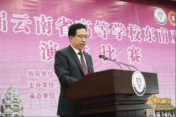 云南师范大学云南华文学院王秀成院长代表云南师范大学致辞,向出席本次比赛的中外贵宾、领导、评委和来自全省30所高校的领队和指导教师、全体参赛学生表示热烈欢迎。他指出,学习通用语言可以走的更远,学习非通语言可以走得更深,云南作为“一带一路”建设的交汇点,学习澜湄五国非通用语言区位优势明显,意义重大。东南亚国家作为我国外交的优先方向,东南亚国家非通用语言专业是云南师范大学重点扶持专业,学校发挥作为“云南省高等学校小语种人才培养示范点”、“云南省高等学校东南亚南亚语种人才培养基地”的作用,着力培养具有专业背景和语言优势、国际视野和国际竞争力的应用型高素质东南亚语种人才取得初步实效。作为承办单位,承诺一定按照云南省非通用语教学指导委员会和教育厅要求全力办好比赛,预祝本届东南亚语演讲顺利举行并取得丰硕成果。