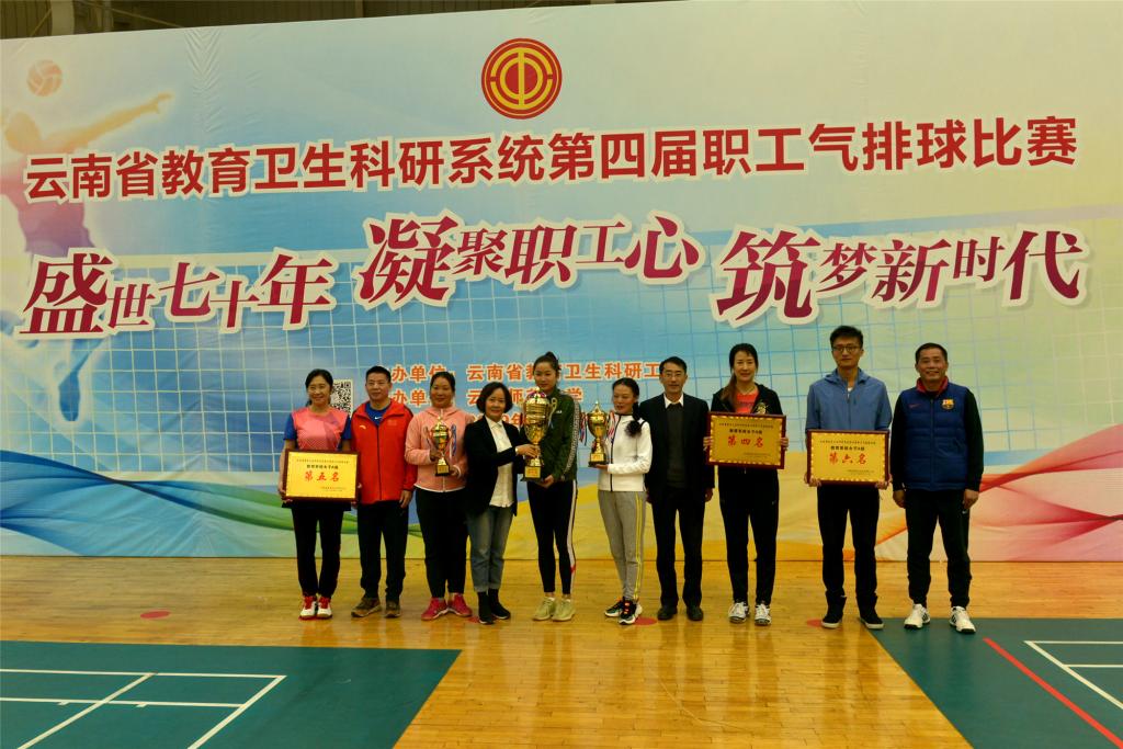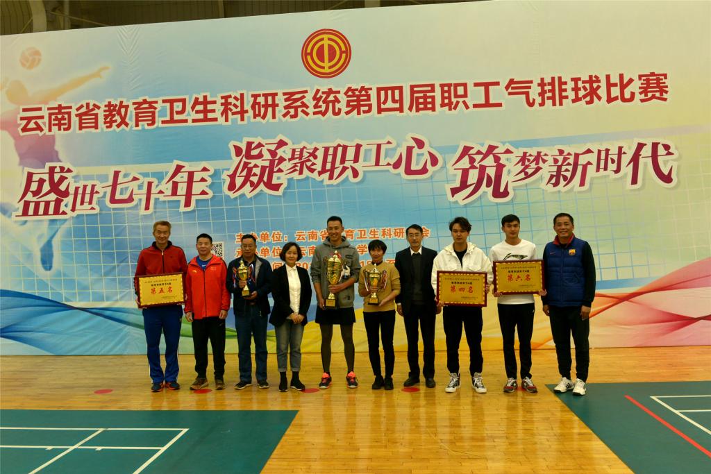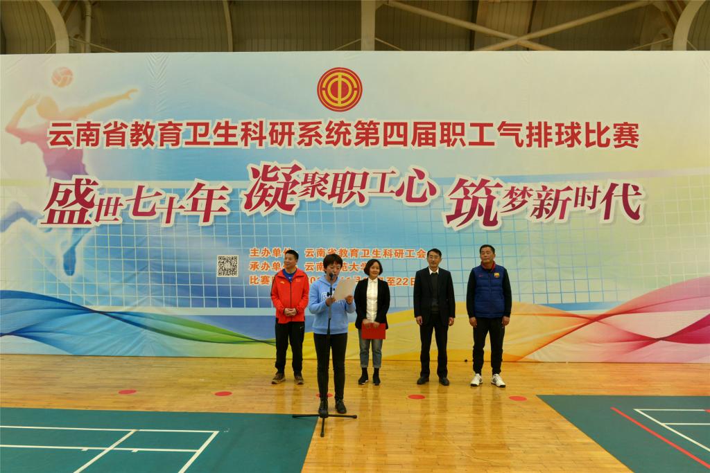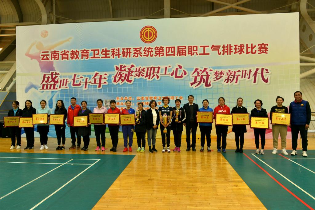 盛世七十年,凝聚职工心,筑梦新时代。经过5天,共计434场比赛的激烈角逐,11月22日下午,云南省教育卫生科研系统第四届职工气排球比赛圆满落下帷幕,闭幕式在我校呈贡主校区和园体育馆举行。云南省教育卫生科研工会副主席、女工委主任田咏华,云南师范大学党委副书记张玮,云南师范大学副校长刘宗立,云南师范大学工会常务副主席金黄斌等出席了闭幕式。