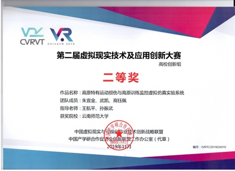 在11月22日举行的第二届中国虚拟现实技术及应用创新大赛(IVRTC 2019)颁奖典礼上,由我校体育学院孙振武院长和王航平副教授指导的作品《高原特有运动损伤与高原训练监控虚拟仿真实验系统》荣获高校创新组二等奖。本次大赛吸引了来自全国各地50多所200多支队伍参赛。参赛高校包括了北京航空航天大学、中国海洋大学、华南理工大学、东北大学、北京科技大学等国内知名高校。