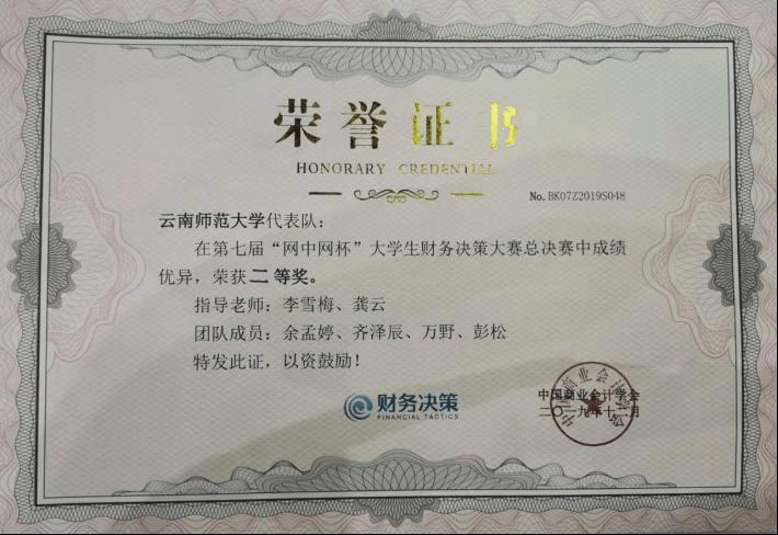 “网中网杯”大学生财务决策大赛自2012年启动至今,已连续成功举办七届,累计参赛院校数超过1000所,累计参赛人数超80000人次,是目前财会专业具有较大影响力的全国性赛事之一。2019年7月,由中国高等教育学会高等财经教育分会指导,中国商业会计学会主办的第七届“网中网杯”大学生财务决策大赛正式启动,共吸引了全国六大赛区、300所高校参与其中。历经四个多月的选拔,最终共有51支参赛代表队脱颖而出,进军全国总决赛。我校代表队以云南省第一名西区一等奖第一次获得参加国赛资格。