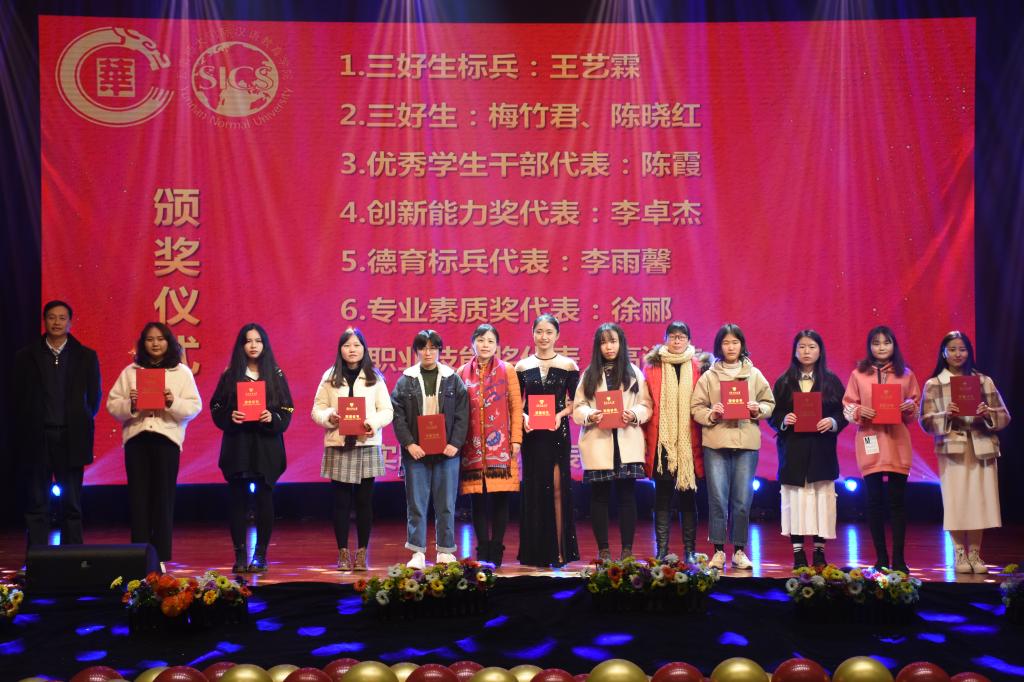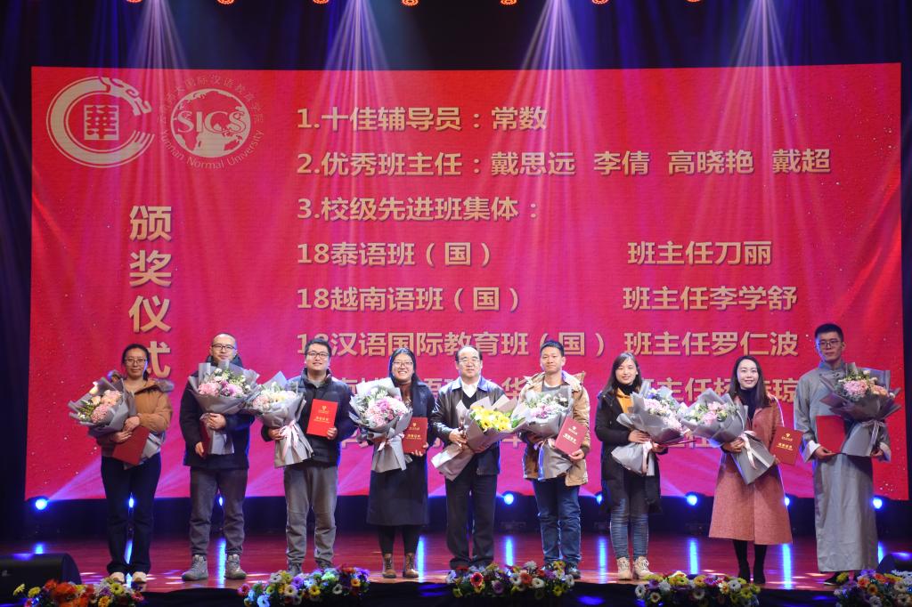 活动中还进行了2019年度优秀师生的颁奖仪式,云南师范大学副校长武友德为获奖教师颁奖,2019年度,华文国语学院共有6名教师、5个班集体获得校级荣誉称号,辅导员常数老师荣获十佳辅导员称号,高萍老师荣获最关爱学生班主任称号,高晓艳老师、李倩老师、戴超老师、戴思远老师分别荣获优秀班主任称号,这些辛勤耕耘在工作岗位上的园丁们,用自己持久的热情和职业素养响应了习近平总书记对广大教师提出的“争做‘四有’好老师”的号召。