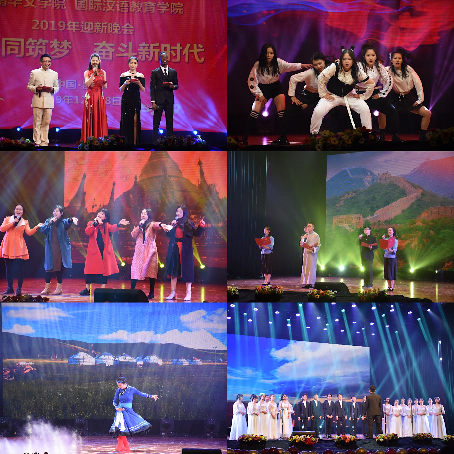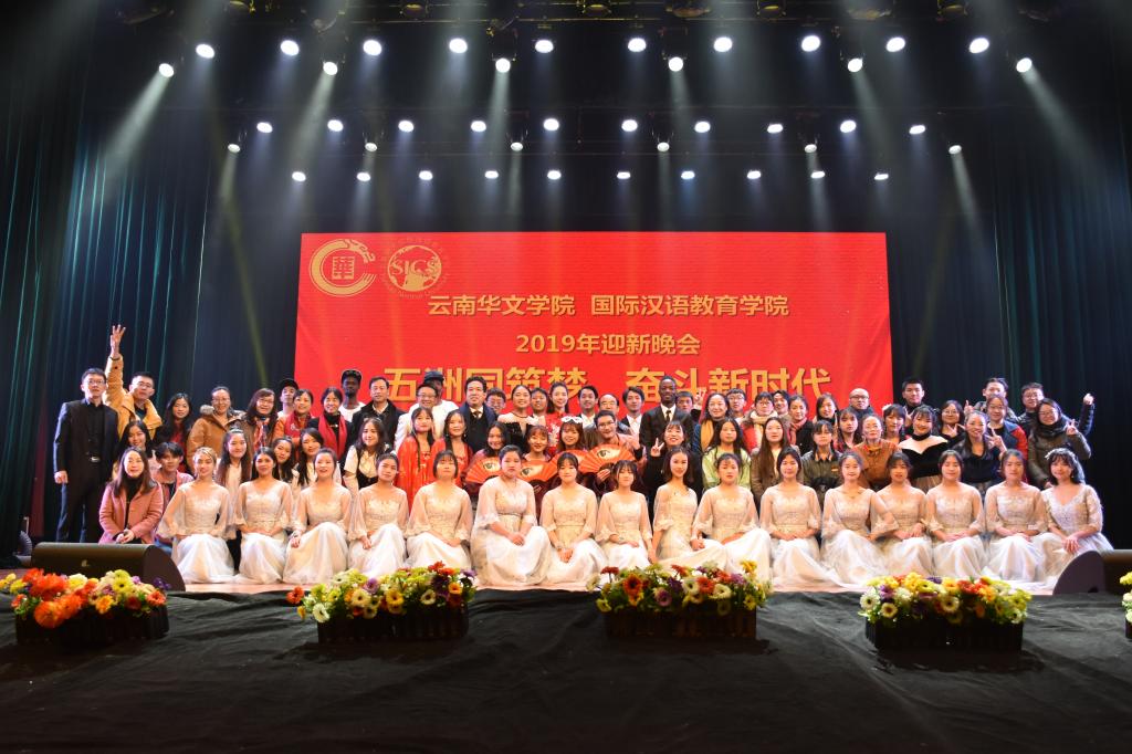 2019年12月8日晚,云南华文学院 国际汉语教育学院2019年“五洲同筑梦·奋斗新时代”迎新晚会暨优秀师生颁奖典礼在明德五号楼演播厅举行。云南师范大学副校长武友德,华文国语学院党委书记和雪莲、院长王秀成、常务副院长段洁云、副书记伏云辉、副院长吴思聪、副院长吴文莉以及教师代表、2019级全体中外本研学生500余人参加活动。