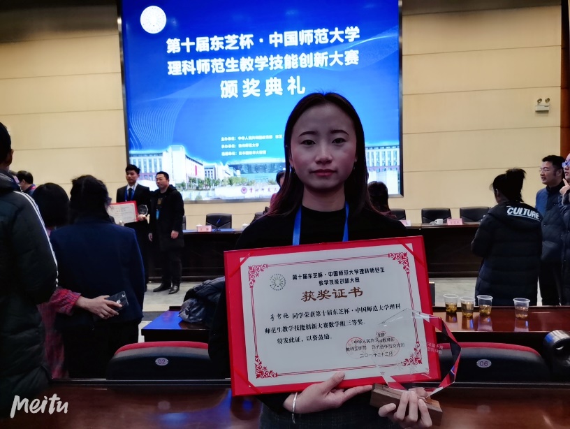 在学校和学院的支持下,物理、化学和数学的教学法老师组建了备赛小组,针对赛事进行了历时数月的选拔和培训工作。在“以赛促练”的核心指引下吸纳对赛事感兴趣并具有一定教技水平的师范生参与,并以此扩大教学竞赛在师生间的影响。我校数学学院2016级学生李雪艳(指导教师孔德宏等)的选题(数学建模 正方形轮子的汽车能否平稳行驶)以及实际教学过程得到了评委的高度评价。在授课中,她自信大方、环节紧凑,注重方法的创新、关注教学的引导,让教学更具学科味,充分展现了云师学子的风采,荣获数学组三等奖,这是我校在近五届“东芝杯”大赛中取得的首次获奖,创近五届东芝杯比赛的最好成绩。