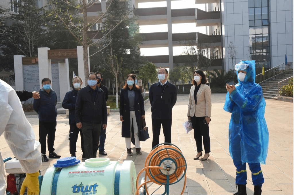 3月18日上午,校长蒋永文,校党委副书记李宏,副校长刘宗立、丁文丽、牛治亮,党委委员、校长助理乜勇以及校办、研究生部、学生工作部、保卫处、资产处、基础教育集团、后勤保障服务中心、校医院等部门负责人先后到云南师范大学附属中学(呈贡校区)、校医院、宿舍、食堂等调研检查,召开疫情防控工作现场办公会,了解安排布置疫情防控工作。