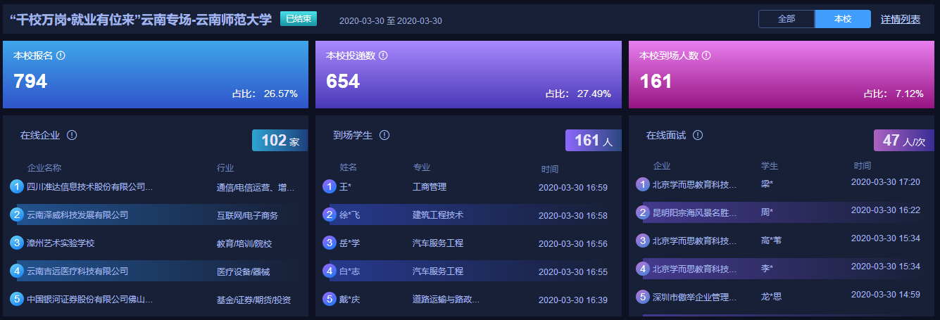 本次线上招聘会共吸引了来自北京、上海、广东、浙江、深圳,云南等全国各地的共193家优质单位参与招聘揽才,涵盖教育、服务、计算机软件、房地产、医疗等行业,提供岗位727个,来自全国各高校的2988名毕业生参加了本次网络视频双选会。