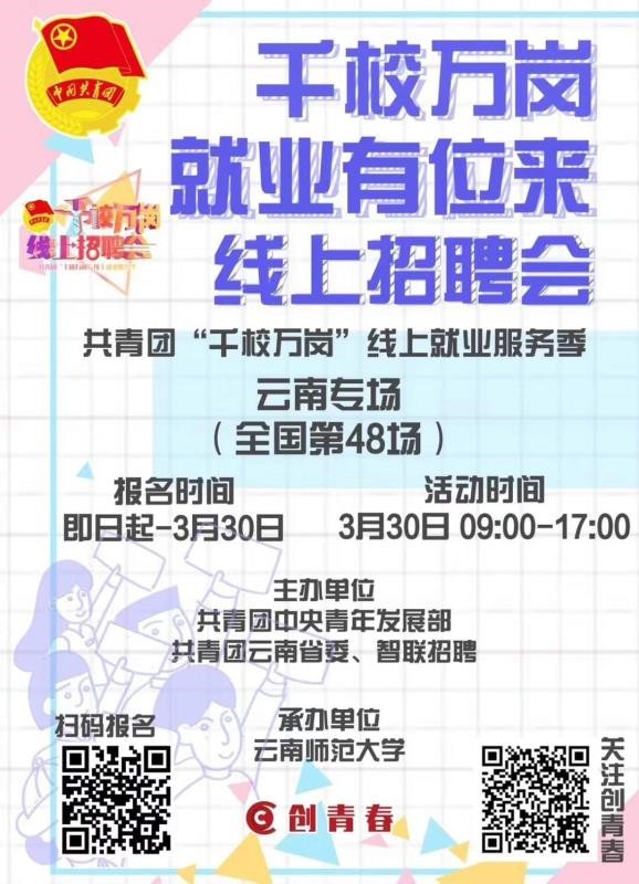 为贯彻习近平总书记关于统筹推进新冠肺炎疫情防控和经济社会发展工作的重要指示精神,落实团中央《共青团“千校万岗”线上就业服务季工作方案》的相关要求,做到“就业服务不打烊,网上招聘不停歇”,减少疫情对毕业生就业工作的影响,促进我校毕业生更充分和更高质量就业。3月30日,由共青团中央青年发展部、共青团云南省委主办,我校和智联招聘承办的2020届毕业生空中双选会成功举行。