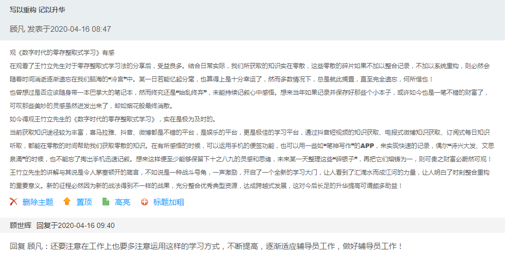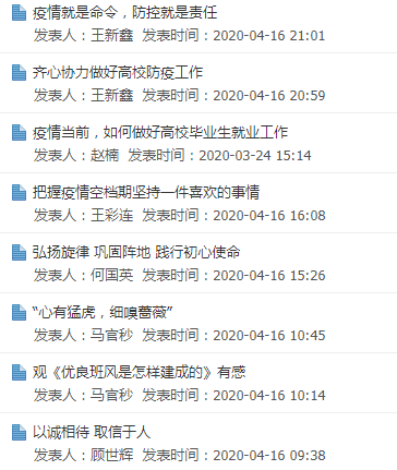 我校辅导员积极参与网上课程的学习,收看了四场直播答疑,同时在学习交流中的班级研讨主题数达到130余次,回帖数有80余次。参加学习的老师们纷纷表示:非常感谢此次培训,在这特殊时期还能够依托网络资源进行学习提升,是一次宝贵的经验,深刻感受到疫情防控下党中央的全面领导和中国群众的凝聚力,清楚地认识到了在此次疫情中作为辅导员所肩负的责任之重,要不遗余力地向同学们讲好中国抗疫故事,宣传中国制度优势,鼓励同学们坚定理想信念、树立爱国情感、学好干事本领、增强使命担当。