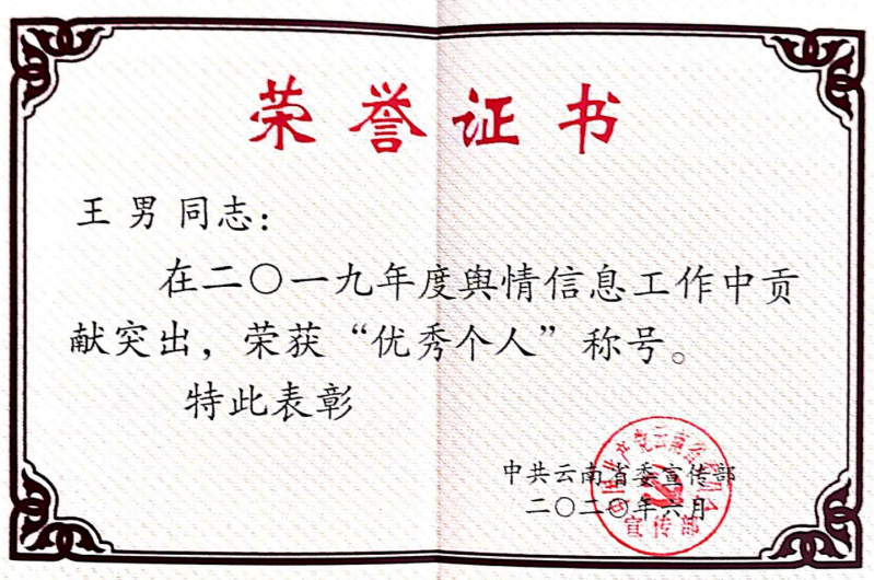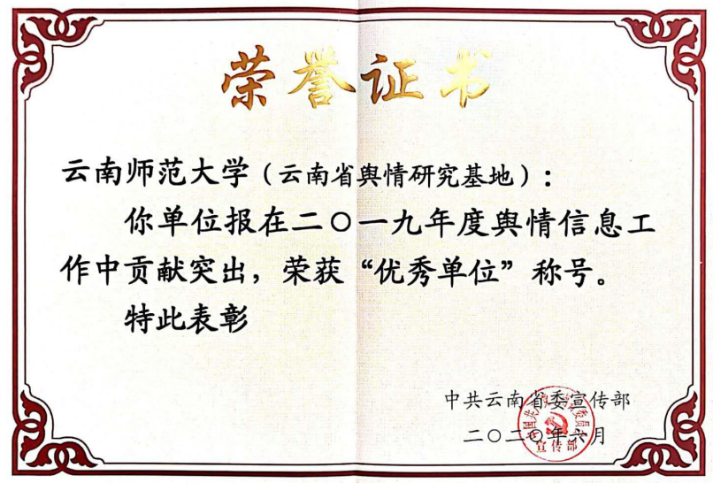 云南省舆情研究基地在会上进行了舆情信息工作的经验交流发言,并荣获 2019 年度舆情信息工作“优秀单位”称号。王男同志荣获“2019 年度舆情信息工作优秀个人”称号,1 篇舆情信息被评为“2019 年度舆情信息优秀稿件”,3 篇舆情信息被评为“2019 年度优秀综合信息稿件”。