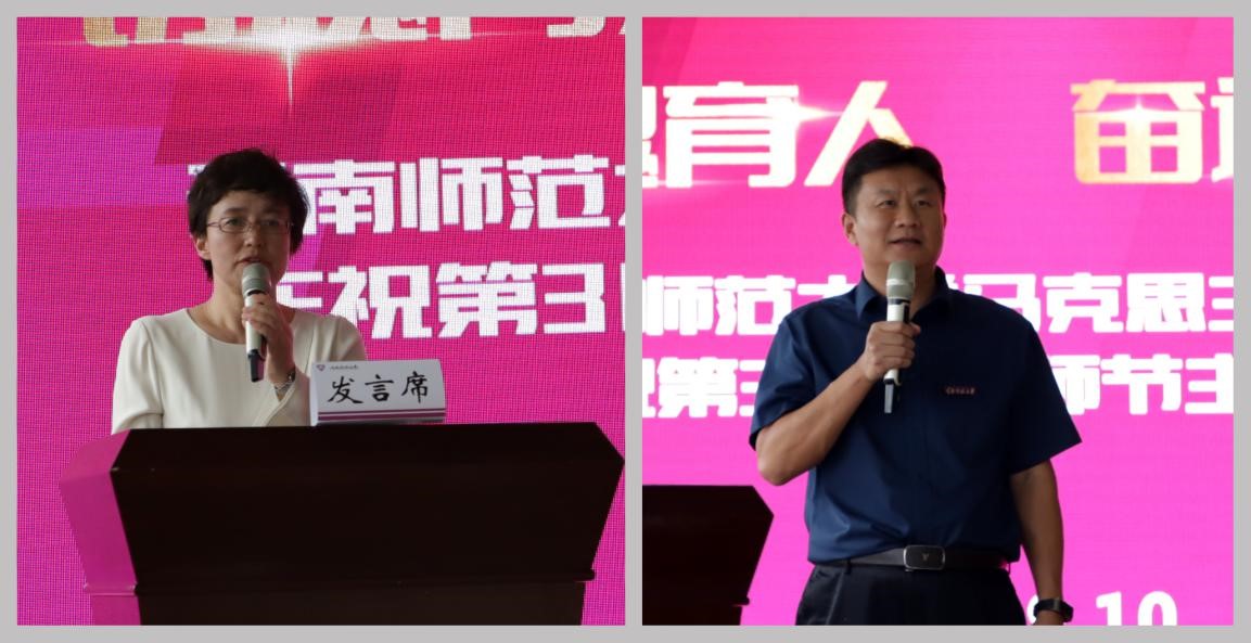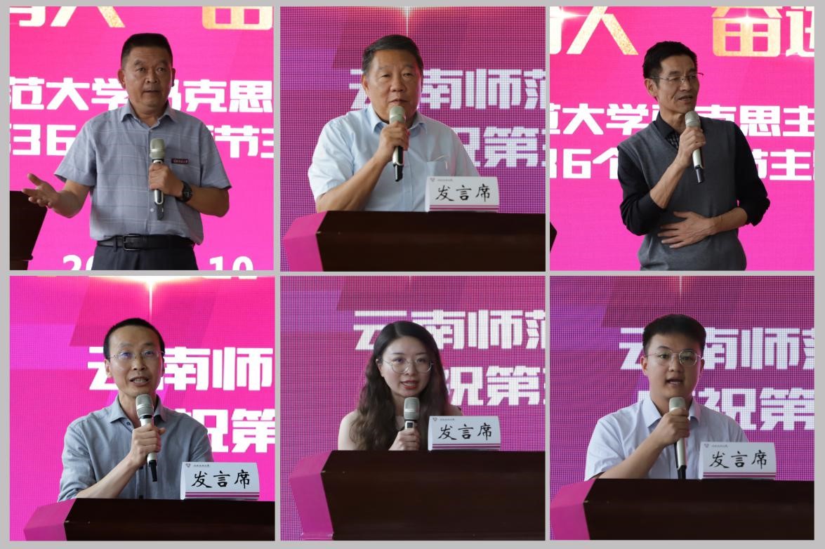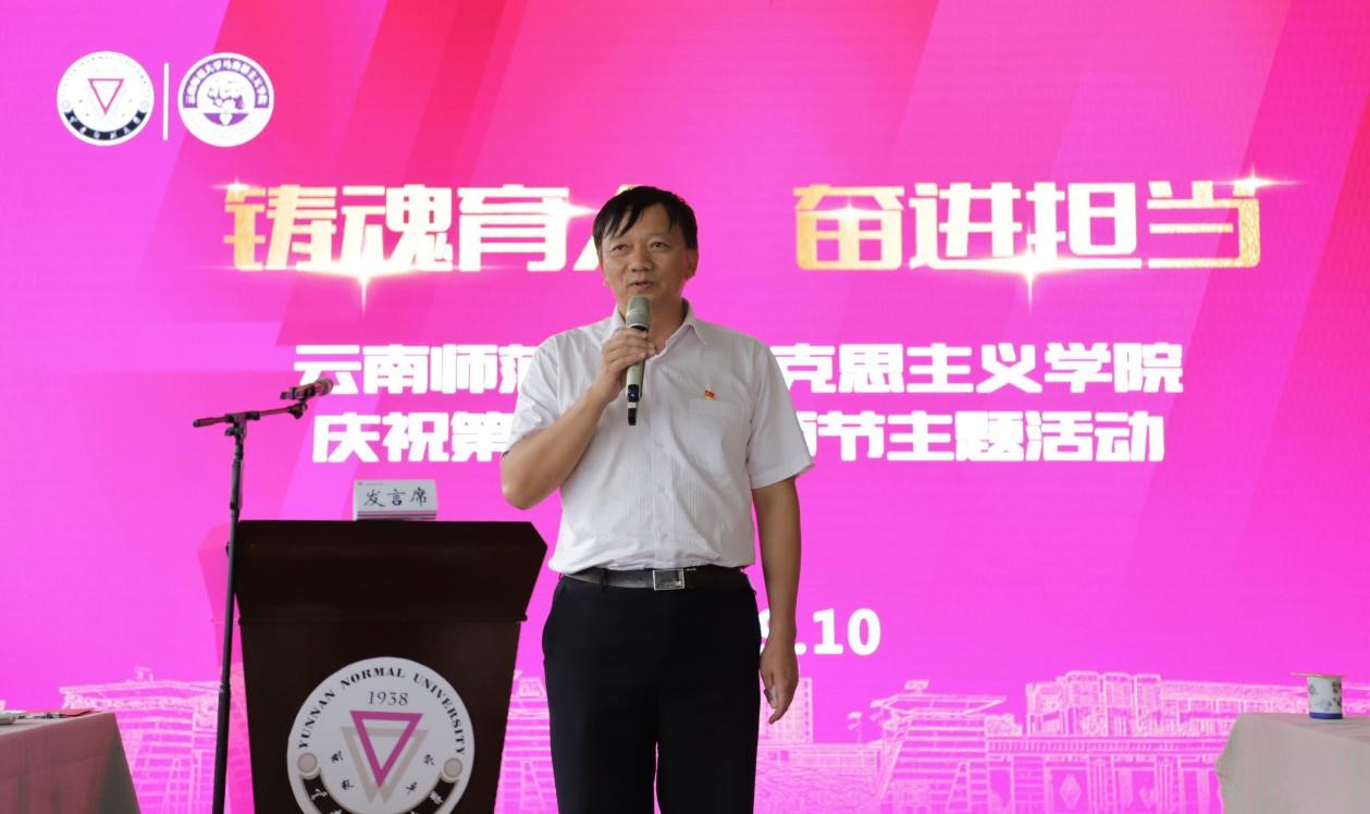 马克思主义学院党委书记张健和院长刘化军,老中青教师代表张旭、罗文、杨志明、周郎生、万钰莹,学生代表骆鑫分别作了发言,为学院教师送上节日的诚挚祝福,并结合各自的求学从教经历,分享了成为思政教育工作者以来的感悟,表达了对马克思主义学院未来发展的信心和祝愿。
