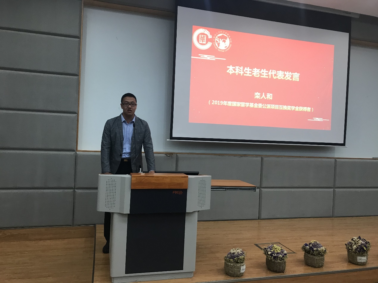 在校生代表2017级越南语专业栾人和同学发言,作为国家留学基金管理委员会2019年度国家互换奖学金留学人员,他分享了自己的学习经历,向学弟学妹们介绍了学好非通用语种的经验方法,并希望大家勇于尝试,积极进取。