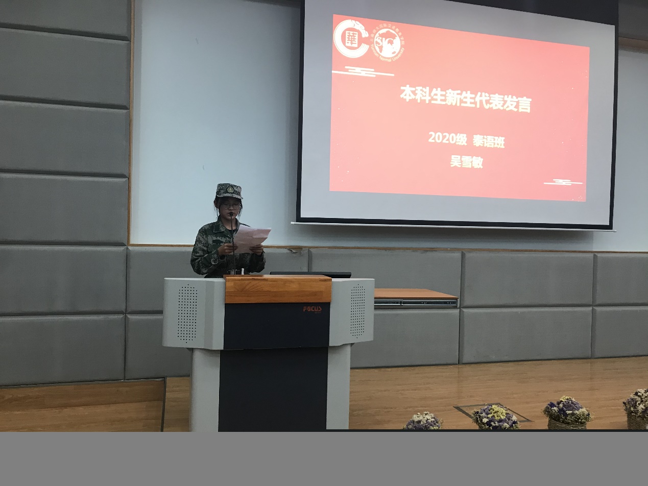 2020级泰语专业吴雪敏同学作为新生代表发言,她与同学们分享了自己备战高考的历程,表达了未来学习好专业课的信心。