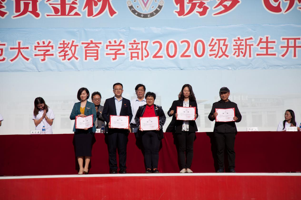 随后,在主席台就坐的领导和老师为教育学部2020级新生班主任颁发聘书,并举行了2020级全体新生佩戴校徽仪式和新生宣誓仪式。