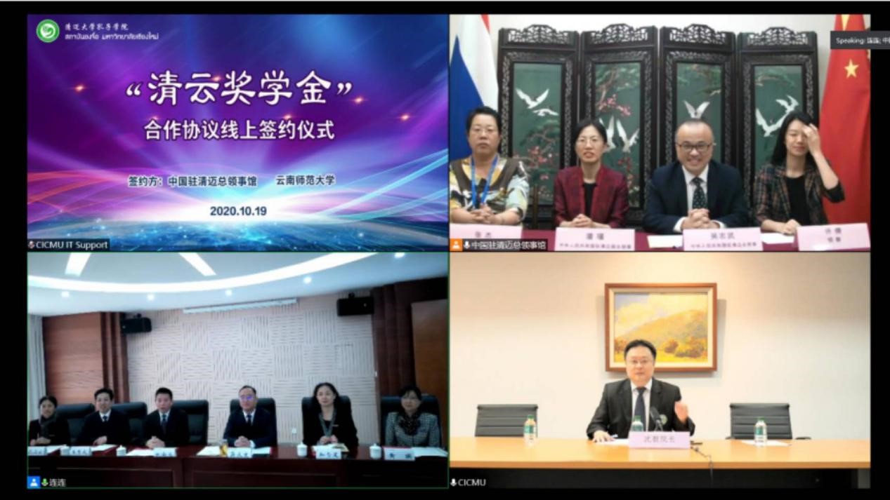 2020年10月19日上午,我校与中国驻清迈总领事馆“清云奖学金”合作协议线上签约仪式在呈贡主校区行政楼340会议室举行。中华人民共和国驻清迈总领事馆吴志武总领事、潘谨副总领事、许倩主任、张杰领事,云南师范大学校长蒋永文、副校长刘宗立、云南华文学院党委书记和雪莲、院长王秀成以及对外合作交流处、华文学院、清迈孔子学院主要负责人参加了此次签约仪式。签约仪式由刘宗立副校长主持。