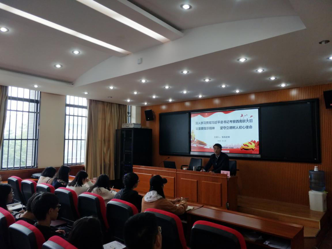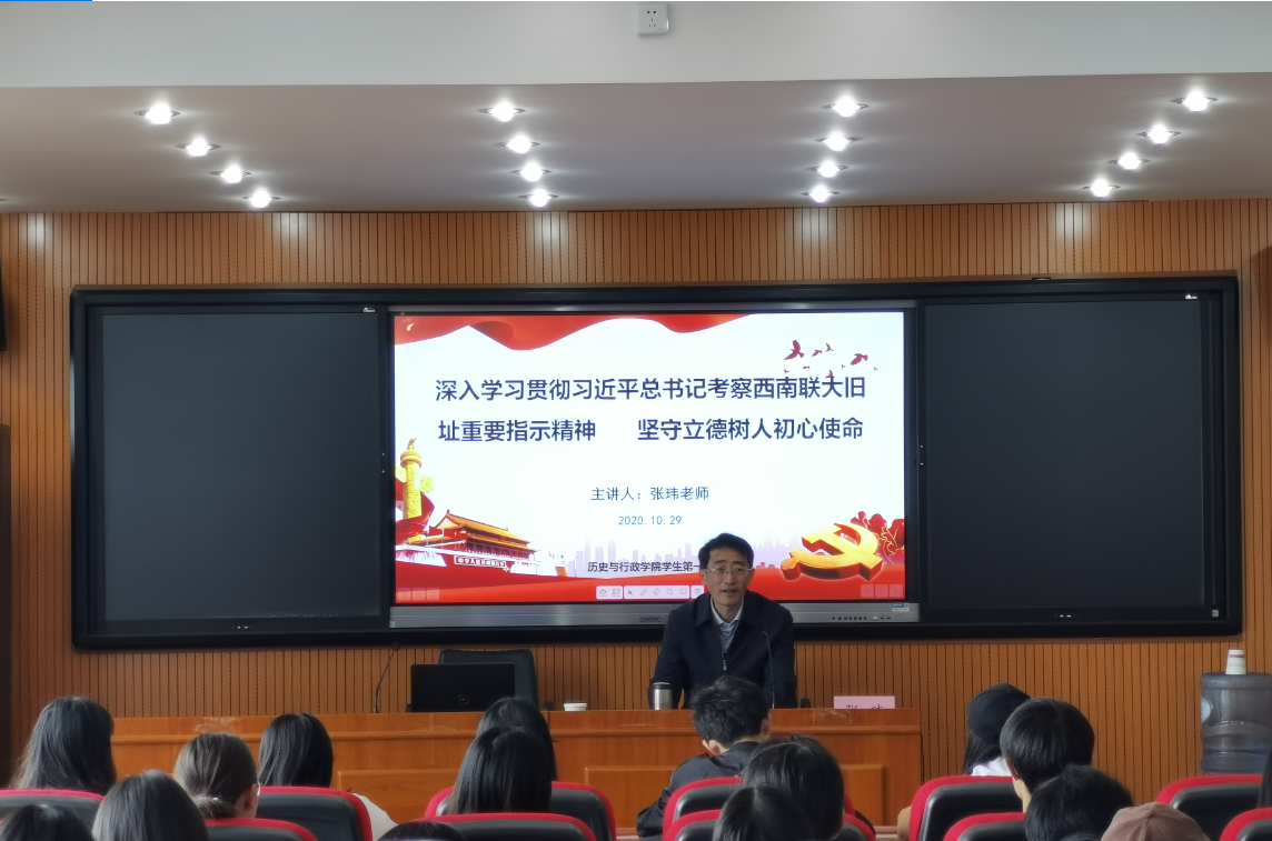 10月29日下午,校党委副书记张玮同志在明德3号楼以“深入学习贯彻习近平总书记考察西南联大旧址重要指示精神 坚守立德树人初心使命”为主题为历史与行政学院学生第一党支部党课。历史与行政学院党委委员党委副书记徐振坤学生第一党支部50余名党员、发展对象、入党积极分子聆听了党课。