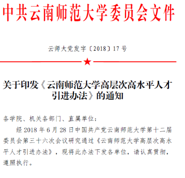 不断完善人才工作顶层设计,积极推进人事制度改革,制定实施《云南师范大学高层次高水平人才引进方法》《云南师范大学“十三五”师资队伍建设规划》《云南师范大学岗位履职考核办法(试行)》《云南师范大学绩效工资分配办法(试行)》《云南师范大学岗位聘用制总则》《云南师范大学联大学者奖励办法》《云南师范大学进人程序及管理办法》《云南师范大学教职工攻读学位和进修访学管理办法》《云南师范大学非事业编制人员管理办法》《云南师范大学职称评审管理办法(试行)》《云南师范大学高级专家延时工作管理暂行办法》《云南师范大学教职工探亲待遇管理办法》等文件。