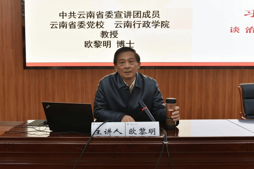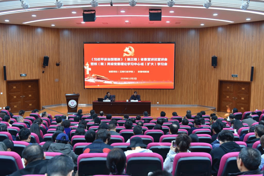 为认真学习宣传《习近平谈治国理政》第三卷,把学习宣传贯彻习近平新时代中国特色社会主义思想和习近平总书记考察云南重要讲话精神不断引向深入,引导师生读原著、学原文、悟原理,12月2日,我校于呈贡校区汇学二号楼报告厅举行《习近平谈治国理政》第三卷省委宣讲团宣讲会暨校(院)两级党委理论学习中心组(扩大)学习会。省委宣讲团成员、省委党校(云南行政学院)原副校(院)长欧黎明教授应邀作主题宣讲,宣讲会由校党委副书记李宏主持。全体校领导、全校副处级及以上领导干部、思政课教师、部分教师和学生代表参加了宣讲会。