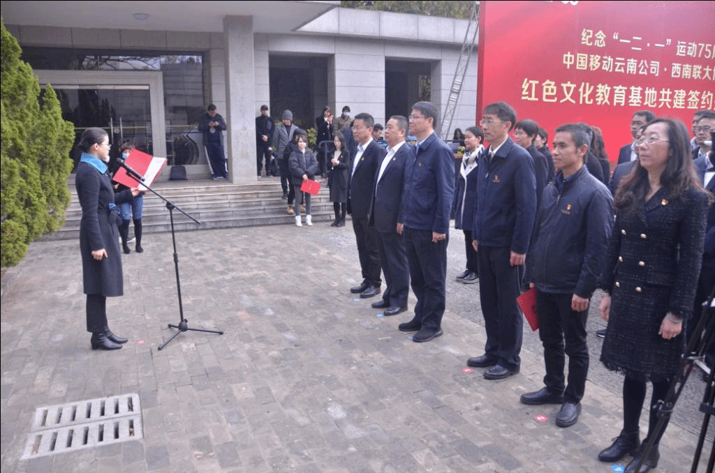 为纪念“一二·一”运动75周年,缅怀革命先烈,巩固深化“不忘初心、牢记使命”主题教育成果,弘扬爱国主义精神,传承红色基因文化。12月1日上午,我校西南联大博物馆携手中国移动云南公司在西南联大旧址“一二·一”运动四烈士墓前广场举行“红色文化教育基地”共建签约揭牌式。中国移动云南公司党委书记、董事长、总经理葛松海,云南师范大学党委副书记张玮,中国移动云南公司党委委员、副总经理、直属机关党委书记黄振旺,中国移动云南公司以及我校西南联大博物馆(西南联大研究所)相关领导出席活动。