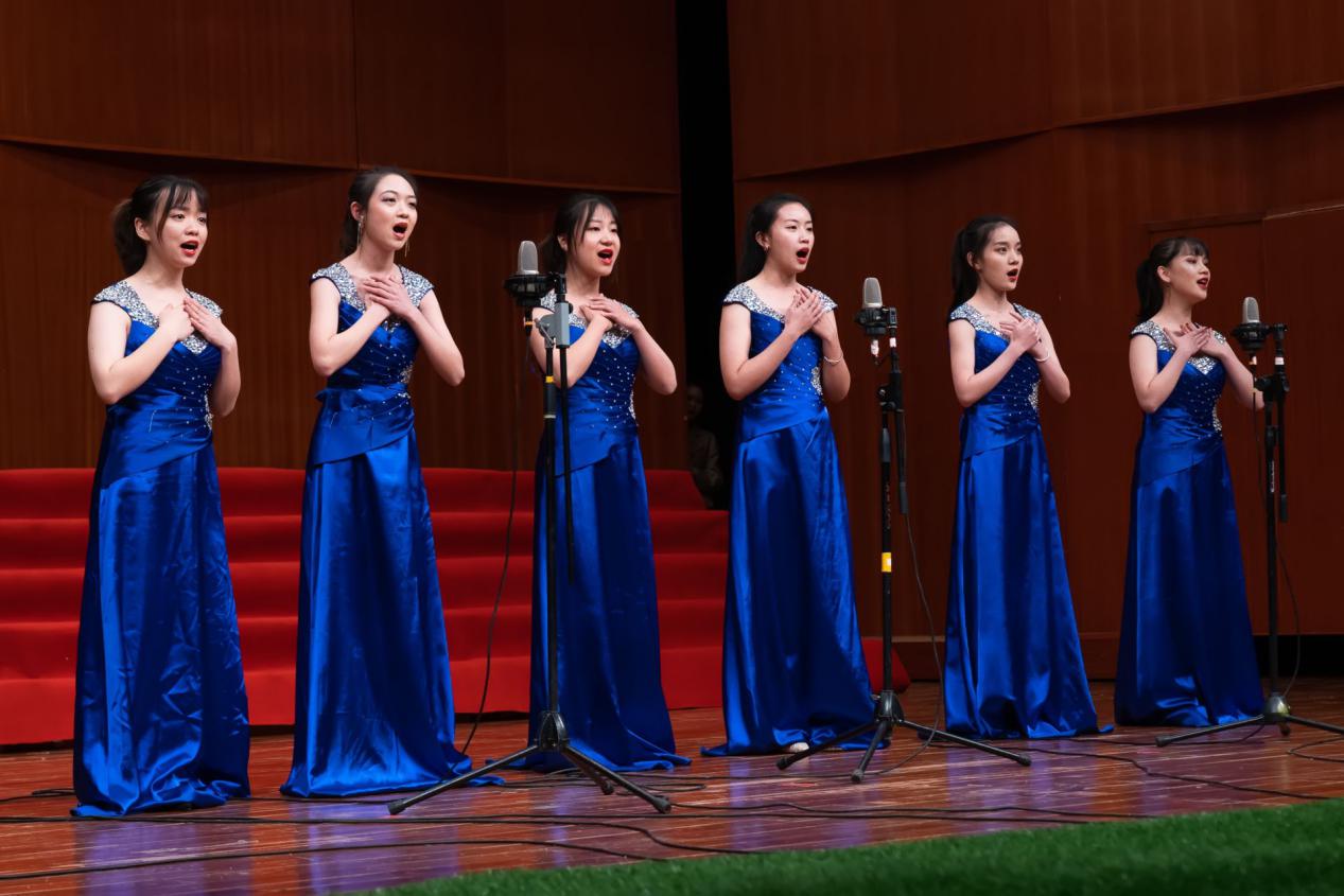演出在合唱《社会主义核心价值观》中拉开序幕。同学们以饱满热情深情地演绎了《毛主席的恩情比山高比水长》《延安颂》《共和国之恋》《我和我的祖国》《把一切献给党》等歌曲,让现场观众深刻感受了青年一代的浓浓爱国情怀。