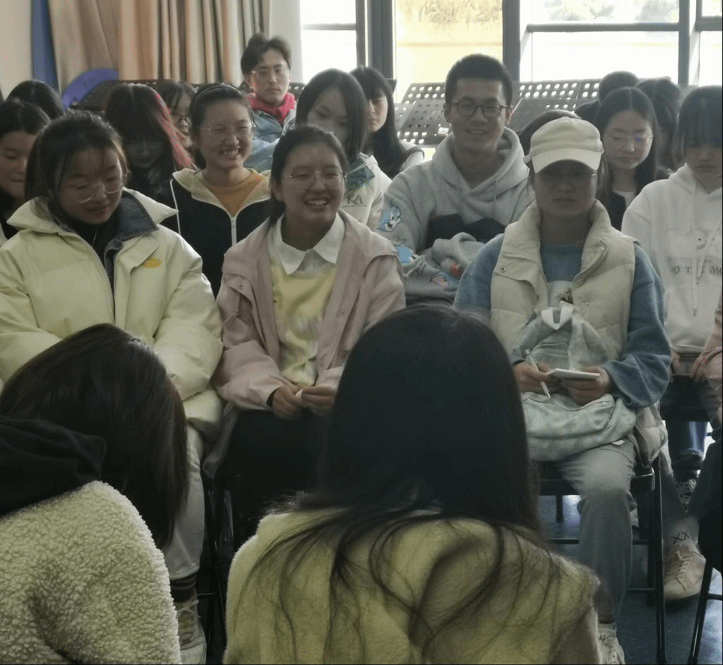 各学生代表纷纷发言,其中,马克思主义学院子梦婷同学介绍说:“张桂梅老师生活简朴,重视红色教育,要求同学们背《弟子规》,学红军长征故事、黄继光英雄事迹,引导同学们热爱党热爱祖国,对学生影响大;她关爱全体学生,从学习成绩第一名到最后一名她都没有放弃,学校学习风气好。”史政学院胡泽欢和数学学院胡泽凤两姐妹都是华坪女高毕业生,在她们的回忆里,张桂梅老师特别注重校园卫生管理,人人爱卫生,人人参加校园卫生清扫活动,教室、宿舍、操场整洁干净。教育学部王颖同学家姐妹三人都上了华坪女高,接受着张桂梅老师细致入微的关爱,她回忆,张老师每天第一个起床开路灯,时间安排井井有条,通过学生看红色影片、党员戴党员徽章、团员戴团徽、开展升旗仪式加强理想信念教育。经管学院杨志兰同学说:“女高学生清一色齐耳短发,节约梳洗时间;新生报到那一刻起,学生自己拿行李,家长不能帮忙,感觉进了校门起自己开始独立了。”物电学院李庭凤表示在张桂梅老师身上感受到了共产党员是真正为人民服务的。信息学院郎贵玲同学眼中的张桂梅老师不论学生成绩如何,都关心爱护女高的每一个学生,大家都很敬畏她,她是大家心目中的“张妈妈”。