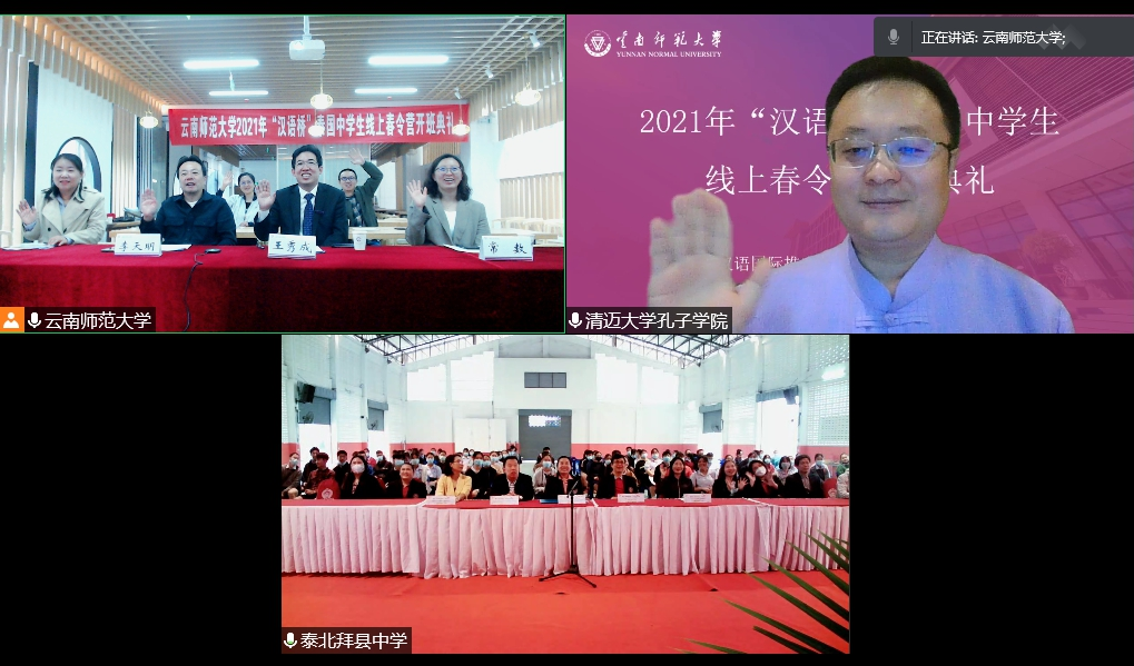 为进一步做好中文国际推广与中外人文交流工作,延续“汉语桥”项目热度,我校国际汉语教育学院承办了国家中外语言交流合作中心2021“汉语桥”泰国中学生线上春令营项目。4月4日上午,春令营开班典礼以“云连线、云直播”的方式,在我校呈贡主校区同析2号楼茶艺教室、泰国清迈地区拜县中学大礼堂和清迈大学孔子学院会议室三地同时举办。国际汉语教育学院院长王秀成、党委副书记常数、副院长李天明,泰国清迈地区拜县中学副校长金达女士,清迈大学孔子学院中方院长沈毅等领导出席,云南师范大学汉语国际推广师资培训基地(昆明)全体工作人员、拜县中学教师代表以及122名春令营营员学生参加,开班典礼由李天明副院长主持。