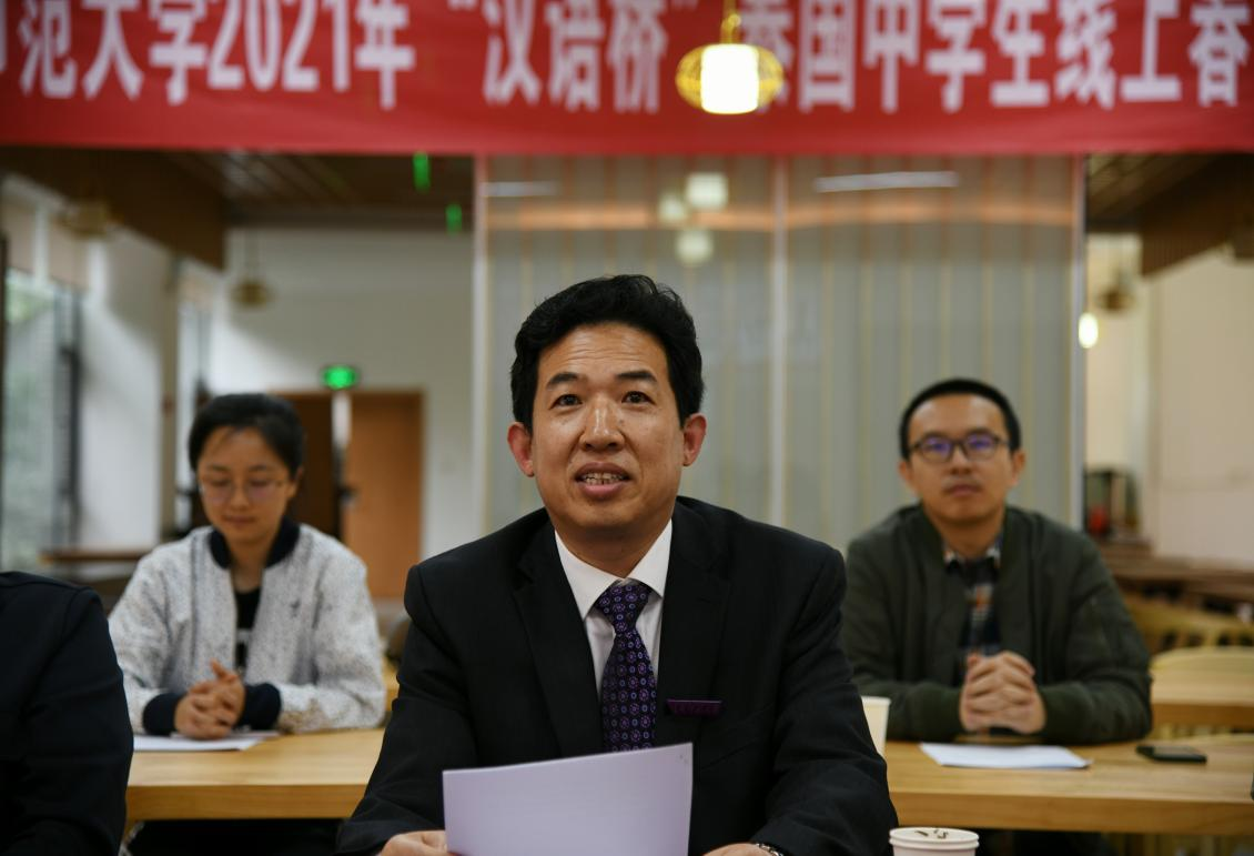 国际汉语教育学院王秀成院长致欢迎辞,他指出自新冠肺炎疫情爆发以来,各国各地区迫不得已暂时封闭,但国与国的联系不会一直中断下去,因为在这个时代,整个世界已越来越成为你中有我、我中有你的命运共同体,所以今天中泰双方通过网络,以“相聚云端”的方式举办这次活动。这是国际汉语教育学院首次以线上方式举办“汉语桥”外国中学生春令营,项目为期7天,整合学院20位专职教师,共开设汉语课、文化课、专题讲座等十余门课程,还融入了云南著名名胜古迹文化区实景拍摄等内容,预计课程直播时长超1680分钟,课程录播时长超230分钟,希望外国中学生能在“云学习,云体验”中身临其境,学有所获。