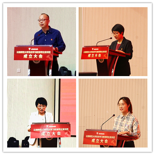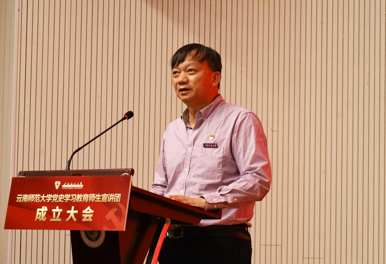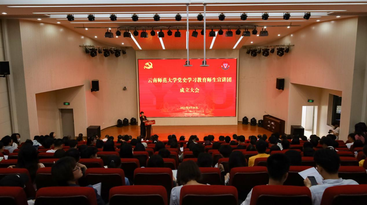 大会伊始,全体师生起立、奏唱国歌。随后,全体师生观看了习近平总书记在党史学习动员大会上的重要讲话的新闻联播片段,党委宣传部部长余冰释宣读了《关于成立云南师范大学党史学习教育师生宣讲团的决定》。