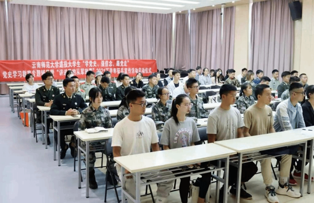 2021年4月29日下午,副校长蔡金红、学生处和武装部相关负责人在云南师范大学实训楼101报告厅举办了云南师范大学2021年下半年“讲述我的从军故事”征兵宣传活动启动仪式。