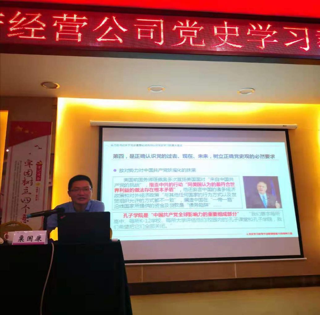 为深入学习贯彻习近平新时代中国特色社会主义思想,深刻感悟中国共产党始终不渝为人民的初心宗旨,从党的百年伟大奋斗历程中,汲取前进的智慧和力量。513日下午,资产经营公司党总支邀请到学校党史学习教育教师宣讲团成员马克思主义学院党委委员粟国康老师做党史学习教育专题宣讲。资产经营公司全体共产党员、各企业部门负责人及职工代表共50余人参加了宣讲会。宣讲会由资产经营公司党总支书记李海樱主持。