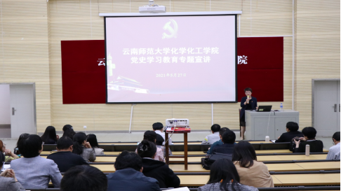2021年5月27日下午,化学化工学院邀请云南师范大学党史学习教育宣讲团成员双晓爱老师,为我院教职工开展了党史学习教育主题宣讲。宣讲会在睿智2号楼110报告厅举行,由学院党委副书记马亚娜老师主持,学院领导班子以及全体教职工参加。